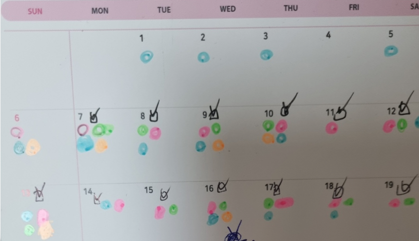 여름이 다가오고 있음이 물씬 느껴지는 한 주 였다. 어느덧 6월 중순, 6월 초 시작한 챌린지를 지속하고 있다.기존과 바뀐 점이 있다면, 1) 오전에 하는 챌린지 업데이트 2) 내가 한 챌린지를 눈에 보이는 달력에서 표기하는 형태로 바꾼 점! 6월부터 시작한 챌린지 중 오전 챌린지는 '하루 두 쪽, 하루 두 줄' 그리고 '자기 긍정 확언', 그리고 하루를 마무리할 때 '자기 관찰 감정 일지' 쓰기를 하고 있다.