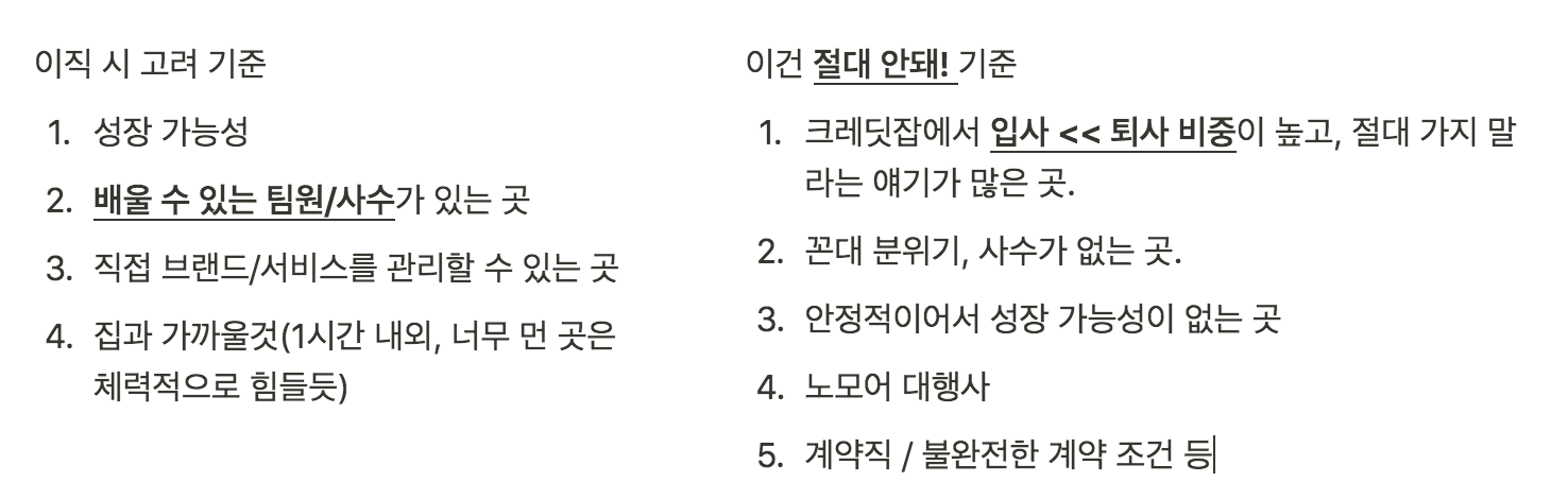 참고로, 이번 년도 이직을 준비할 때 세웠던 기준이 있었다. 내가 바라는 점, 여긴 가지말자고 세워놨던 기준.