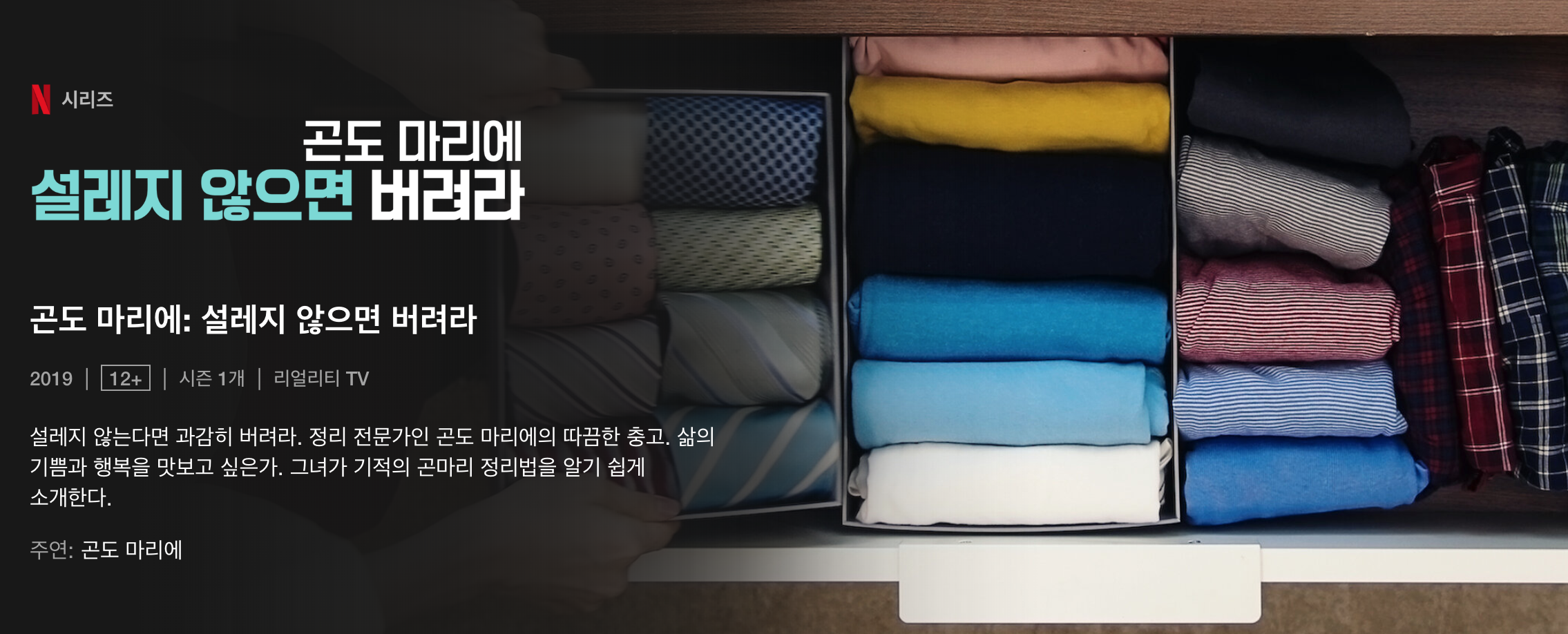 지지난주 주말에 시청을 시작한 넷플릭스 다큐멘터리가 있다. 곤도 마리에의 <설레지 않으면 버려라>. 곤도 마리에는 어지러운 집을 깨끗하게 정리하는 데 가이드와 방법을 알려주는, 일명 '정리 컨설턴트'다. 미국의 가정집을 직접 방문하여 집을 정리하는 옴니버스 다큐 형태로, 실제 어떻게 변화하는지를 관찰하는 다큐멘터리였다.